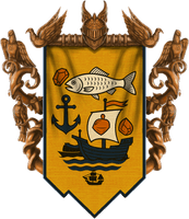 Czarny statek z białym żaglem, na którym widnieje bursztyn, po lewej kotwica, a nad nimi biały szczupak połykający bursztyn, wszystko na złotym tle